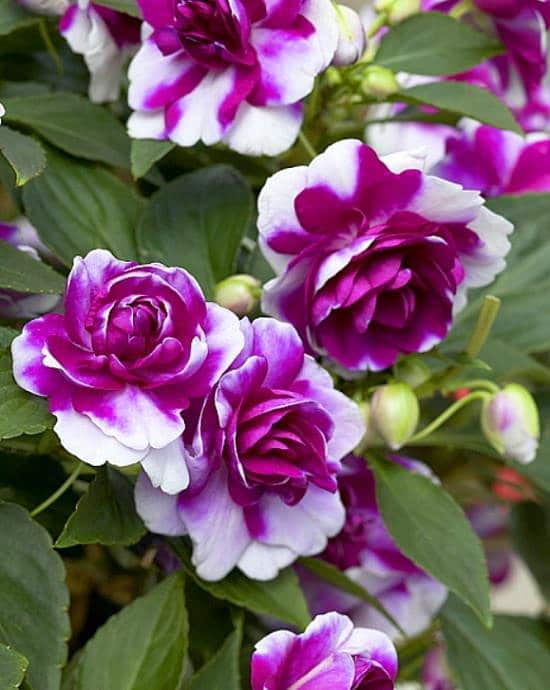 Sans doute l’une des impatiens les plus attrayantes de cette liste, cette variété fleurit tout l’été et présente des teintes violettes et blanches. Comme les autres fiestas, elle pousse entre 12 et 14 pouces de haut.