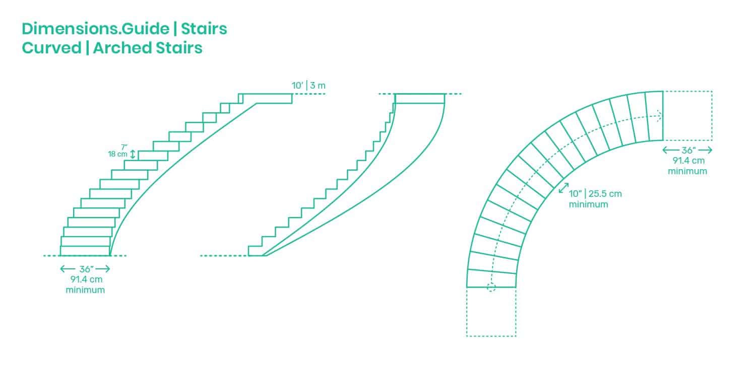 Un escalier courbe standard aura une largeur de 36″ à l’avant de la marche. Les rampes et les poteaux de chaque côté de l’escalier peuvent ajouter entre 10″ et 20″ à la largeur.