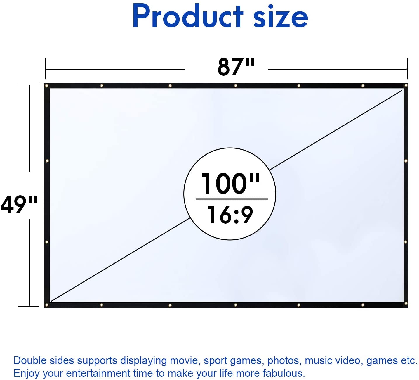 Un écran de projecteur de 100 pouces a une taille totale de 53,7 pouces de hauteur sur 91,9 pouces de largeur. Si vous utilisez un support d’écran ou un support rétractable, l’écran aura besoin de plus d’espace. La diagonale de l’écran est de 100 pouces, et la taille de la vue dépend en fin de compte du rapport hauteur/largeur de l’écran.