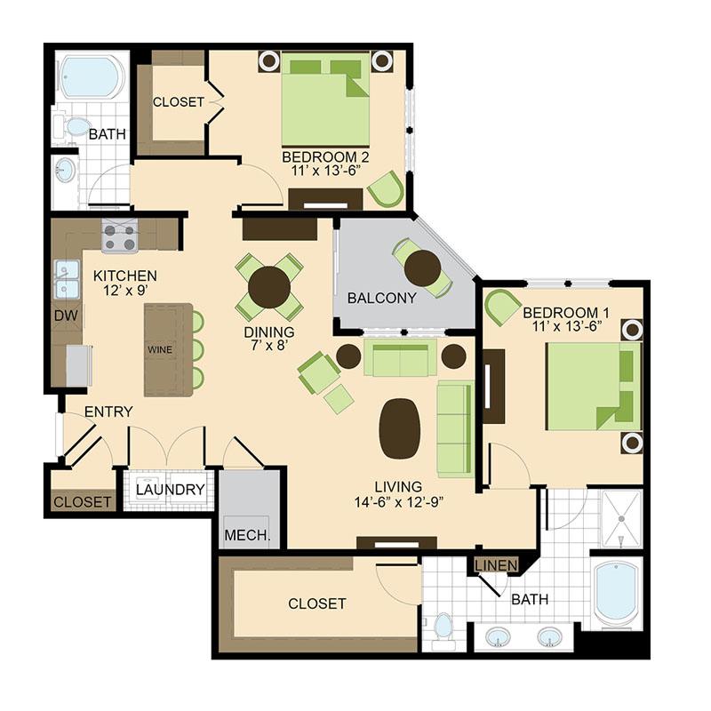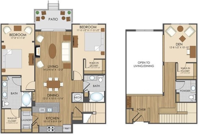 De plus, le plan ouvert de la cuisine, de la salle à manger et du salon vous permet de sortir directement sur le patio. Toutes les chambres sont équipées de placards, et la chambre principale a également une salle de bain dédiée. De plus, il y a une buanderie dans l’unité, ce que vous attendez d’un appartement de luxe.