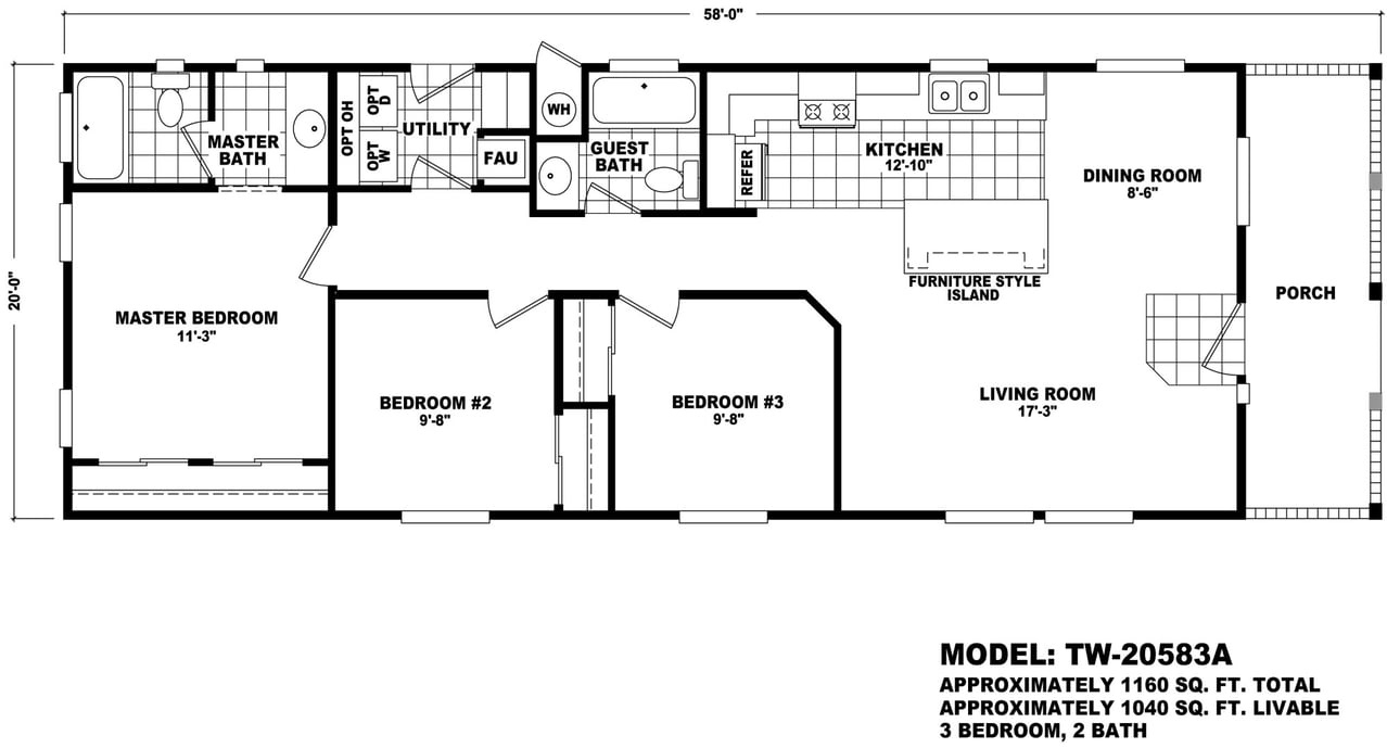 Un îlot de cuisine permet d’ajouter une séparation tout en fournissant des sièges supplémentaires et un endroit supplémentaire pour profiter des repas. Une salle de bain pour les invités se trouve au milieu de la maison, en face d’une des chambres.