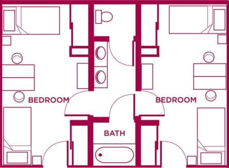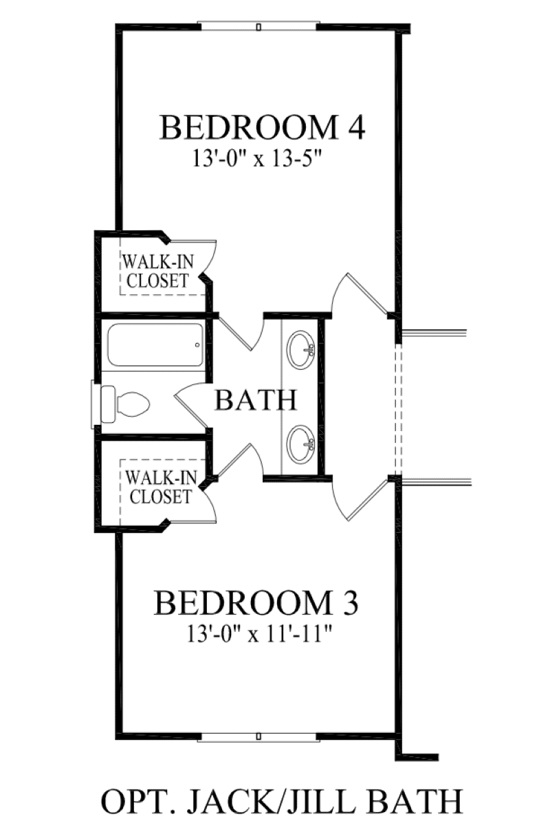 Cette disposition Jack and Jill offre également beaucoup d’intimité, en séparant les toilettes et la baignoire les unes des autres. Les portes des chambres s’ouvrent sur les chambres et sont perpendiculaires et en face des lavabos. Au lieu de passer par les extrémités de la salle de bains, chaque personne passe par le milieu.