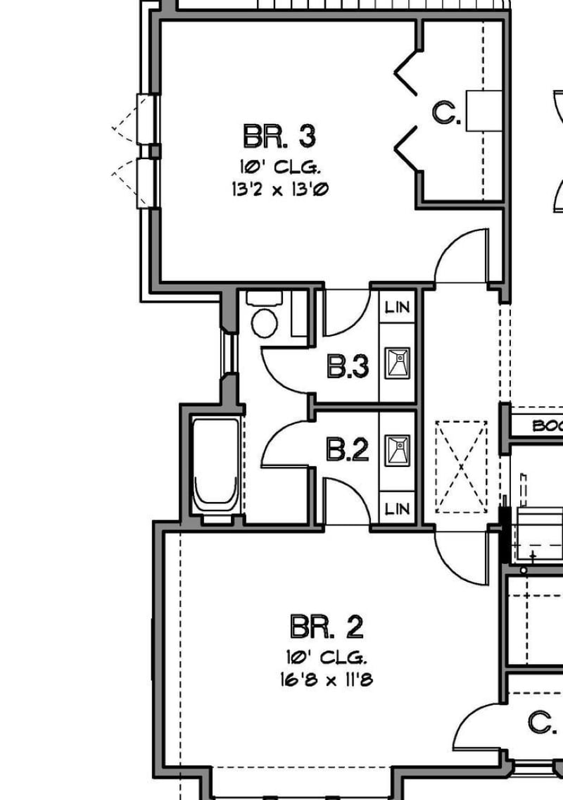 Ensuite, il y aurait une autre porte menant à une baignoire et une douche (ou un combo) partagées. Les toilettes pourraient aussi être dans cette zone, ou vous pourriez trouver une autre séparation pour les toilettes.