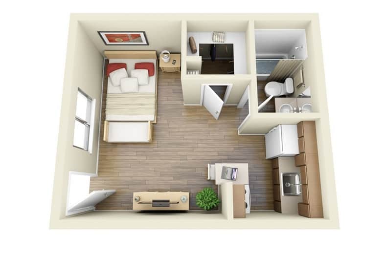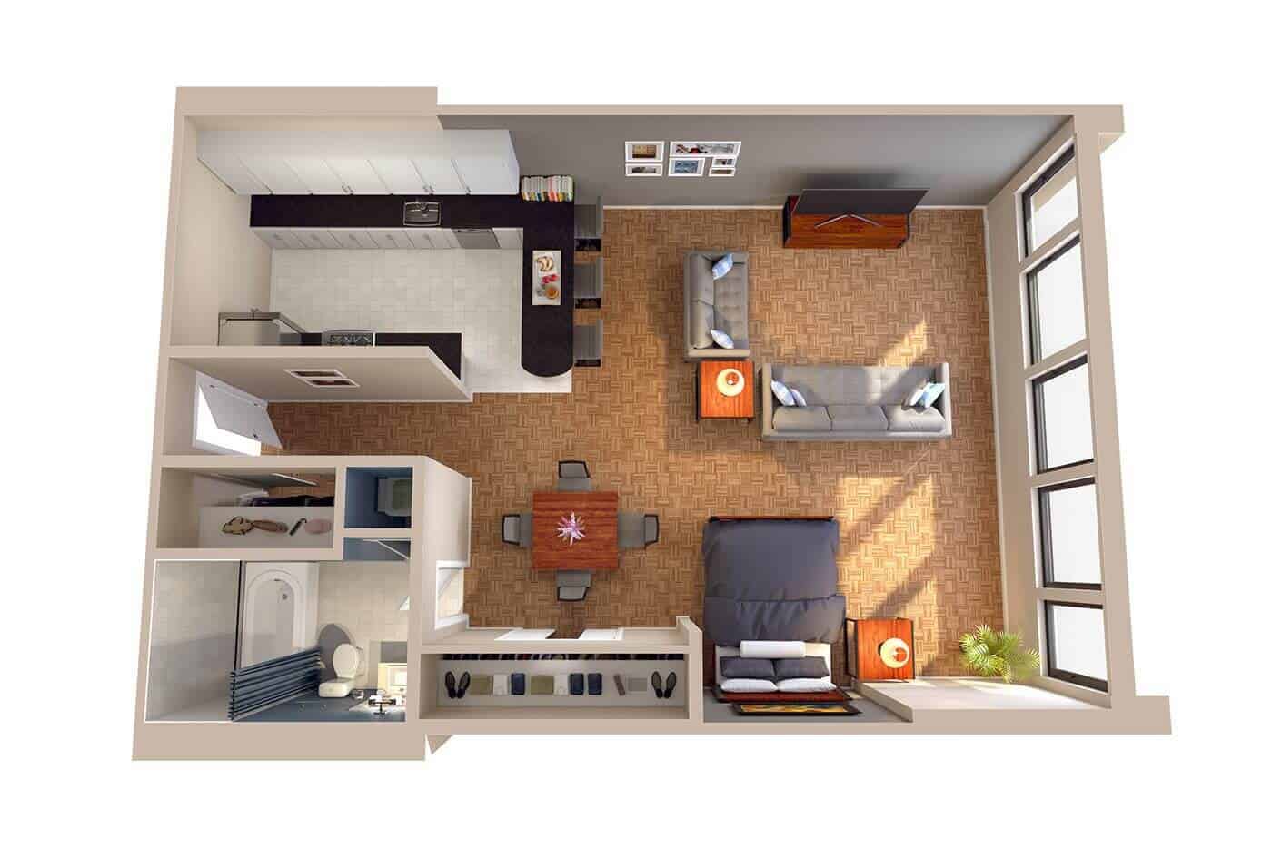 Si vous optez pour un studio comme celui ci-dessous, vous avez tous les éléments essentiels, avec peu d’espace à disposition. Cependant, si vous n’aimez pas l’idée d’entrer dans une chambre à coucher, il suffit de choisir des meubles différents. Dans cet exemple, au lieu d’un lit, vous pourriez opter pour un canapé-lit de haute qualité.