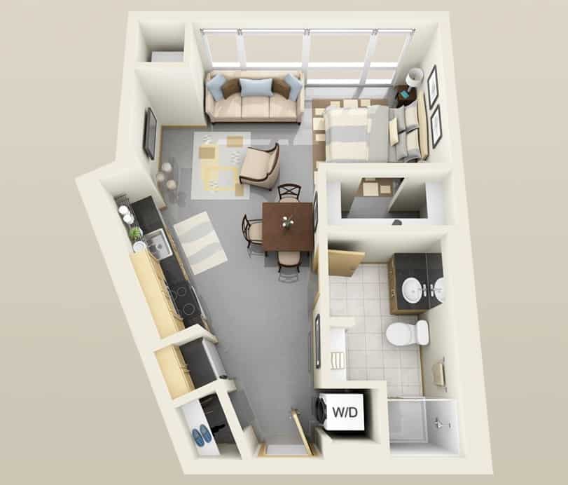 Certains appartements de 500 pieds carrés sont créatifs dès le départ en ce qui concerne leur empreinte globale. Prenez l’exemple ci-dessous, avec une conception unique en angle. Il permet de maximiser l’espace tout en laissant une certaine séparation entre la cuisine et les chambres à coucher.
