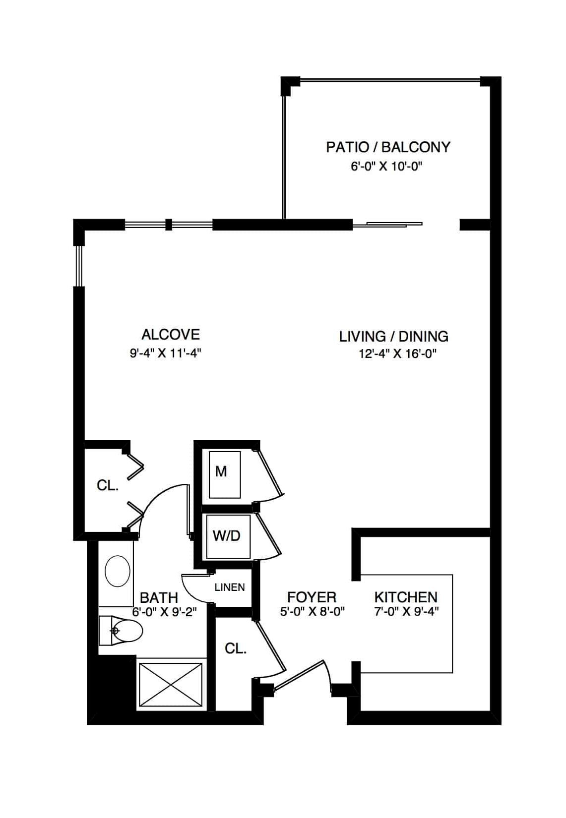 La surface du patio/balcon dans l’exemple ci-dessous mesure 60 pieds carrés, ce qui revient à avoir une petite pièce supplémentaire. Selon les restrictions en vigueur, vous pourriez même être en mesure d’isoler cette zone avec une clôture temporaire. Vérifiez cependant auprès du bureau de gestion avant d’effectuer tout changement.