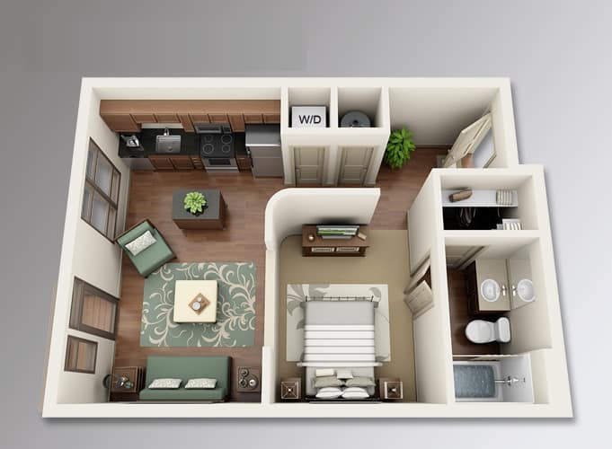Vous entrez dans la cuisine, continuez dans un petit espace de vie, puis tournez le coin dans la chambre. Pour ce plan, si vous préférez un lit plus caché, c’est une excellente opportunité pour un lit Murphy.