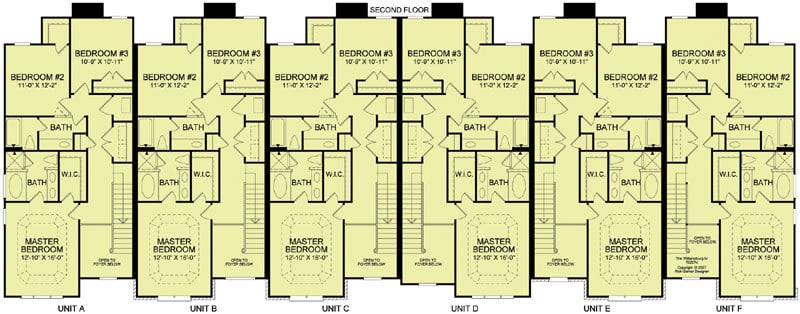 Cet immeuble d’appartements de deux étages et de six unités présente trois unités d’appartements par étage avec deux cages d’escaliers entre les unités. Chaque appartement dispose de deux chambres à coucher, d’une ½ salle de bain et d’un grand espace de vie. Ce plan d’immeuble d’appartements est typique de nombreuses villes urbaines du pays et reste populaire au fil des ans.