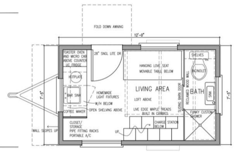 Ainsi, un hangar de 12′ x 8′, soit un peu moins de 8′ de large, est un bon candidat pour une maison mobile. Celle-ci dispose de tout dans un seul espace, y compris une petite kitchenette et une salle de bain étroite. Il y a également un auvent rabattable au-dessus de la porte lorsque la maison est stationnaire.