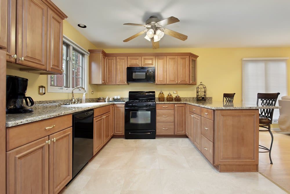 5. Granit beige, armoires en chêne et appareils électroménagers noirs